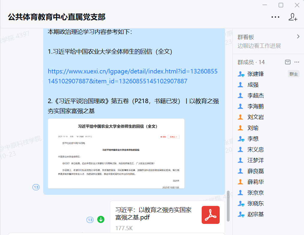 一、基本情况学习时间:2025年10月22日学习地点:公共体育教育教学中心会议室参加人员:中心全体党员教师学习方式:线上预习+线下集中学习学习内容:1.习近平给中国农业大学全体师生的回信(全文)2.《习近平谈治国理政》第五卷(P218)丨以
