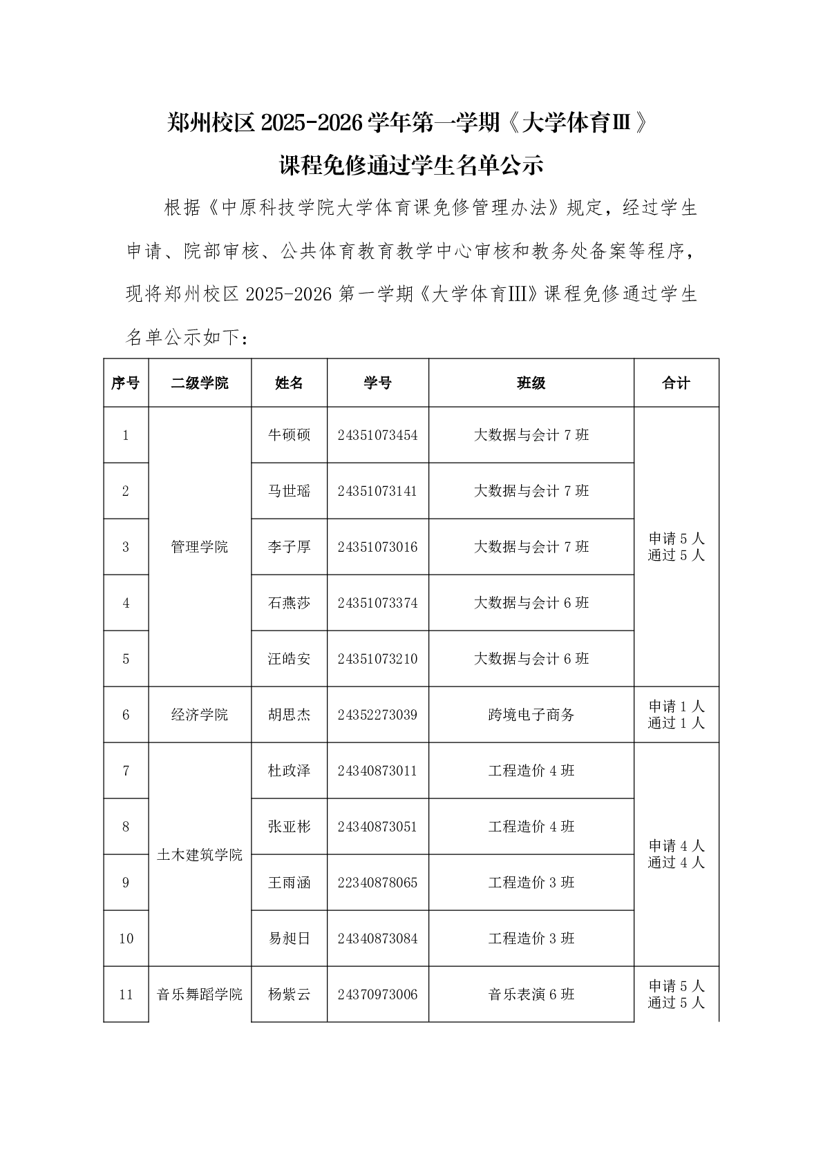 郑州校区2025-2026学年第一学期《大学体育Ⅲ》免修通过学生名单公示