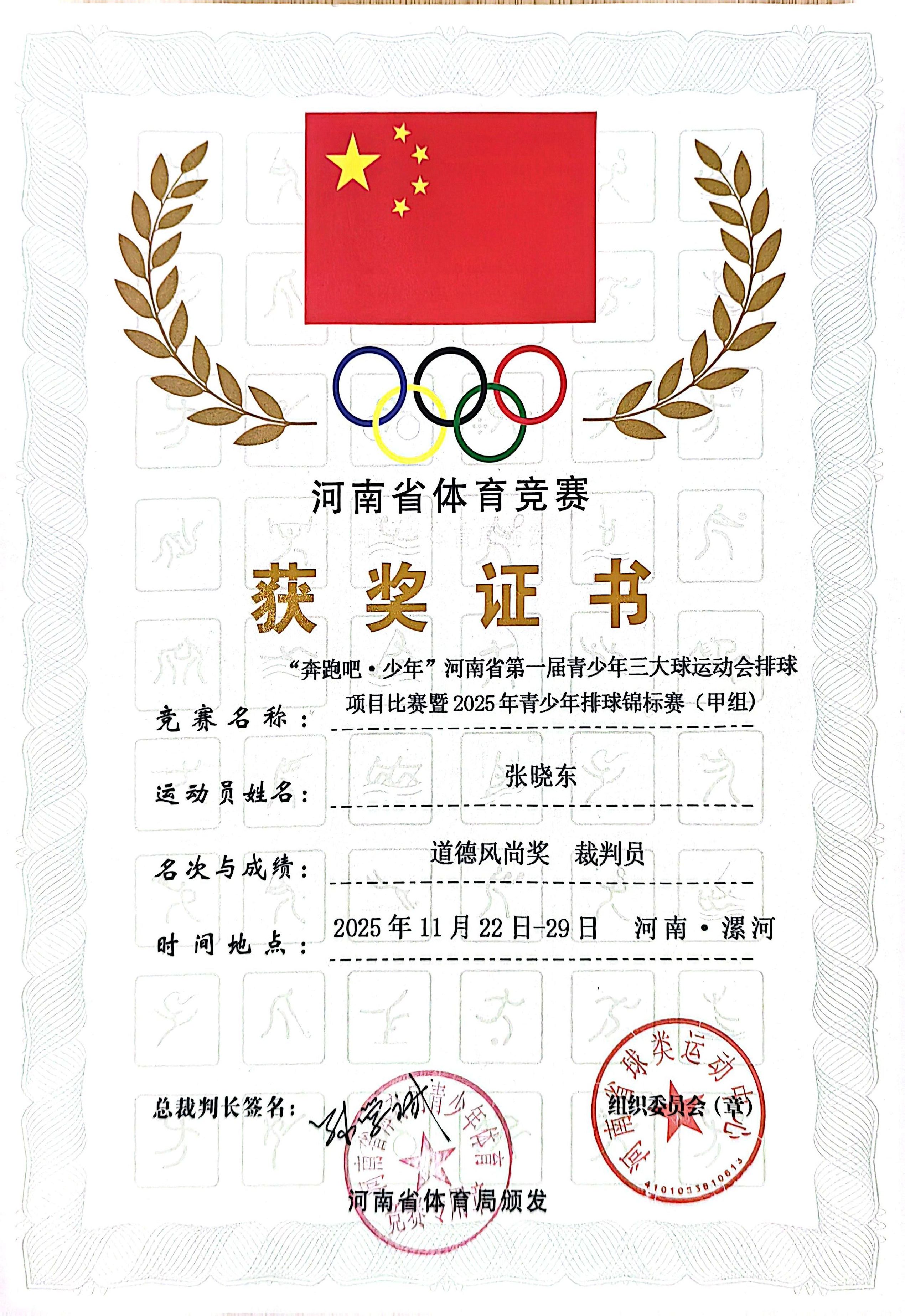 11月22日至29日,“奔跑吧·少年”河南省第一届三大球运动会排球项目比赛暨2025年青少年排球锦标赛(甲组)比赛在漯河市体育中心圆满落幕。我校公共体育教育教学中心张晓东老师受邀担任该比赛的裁判员,张晓东老师以专业的执裁水平和严谨的工作态度,圆满完成了本次赛事的执裁任务,展现了我校教师良好的专业素养和精神风貌。