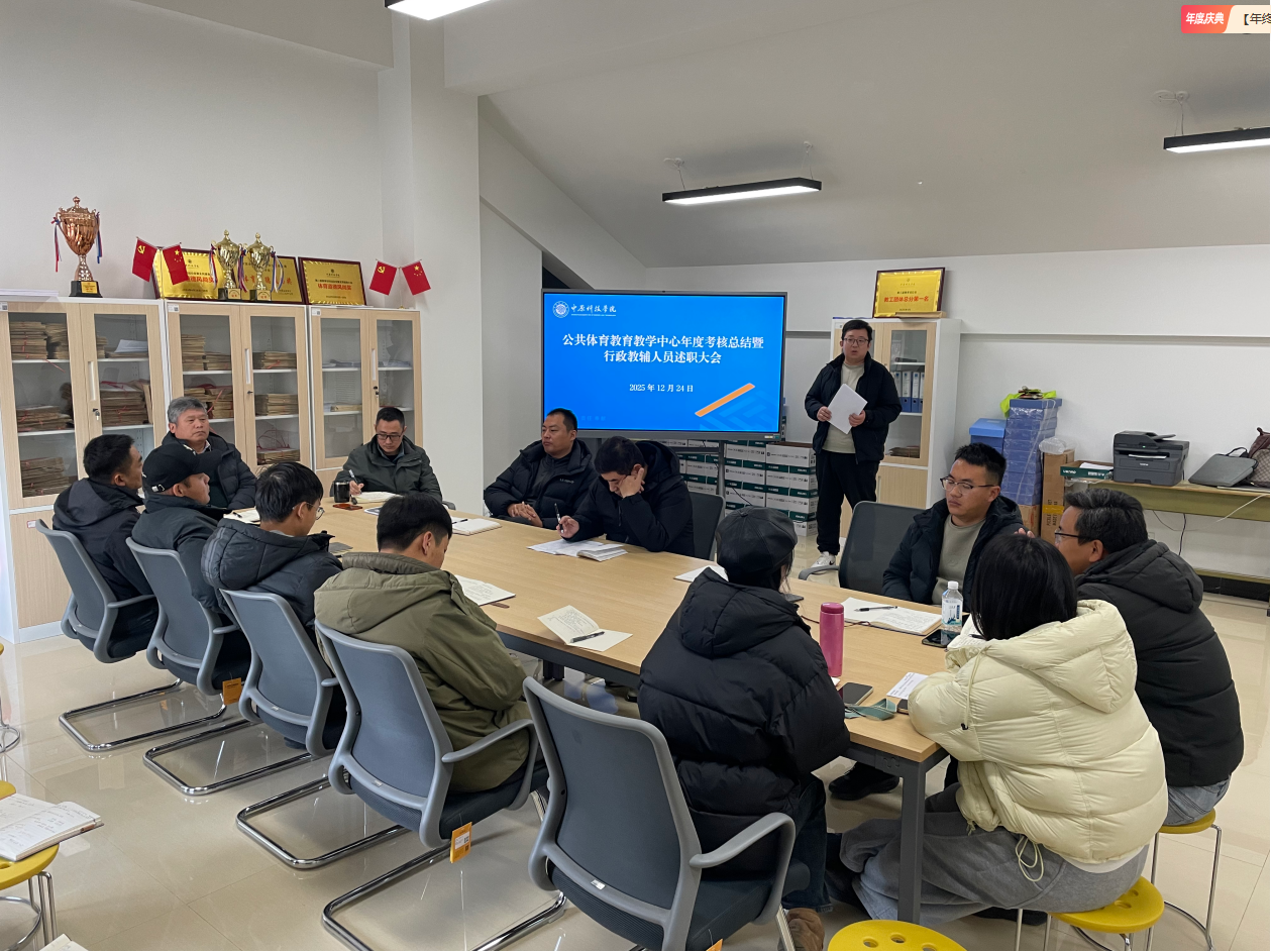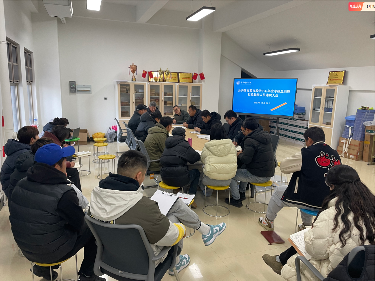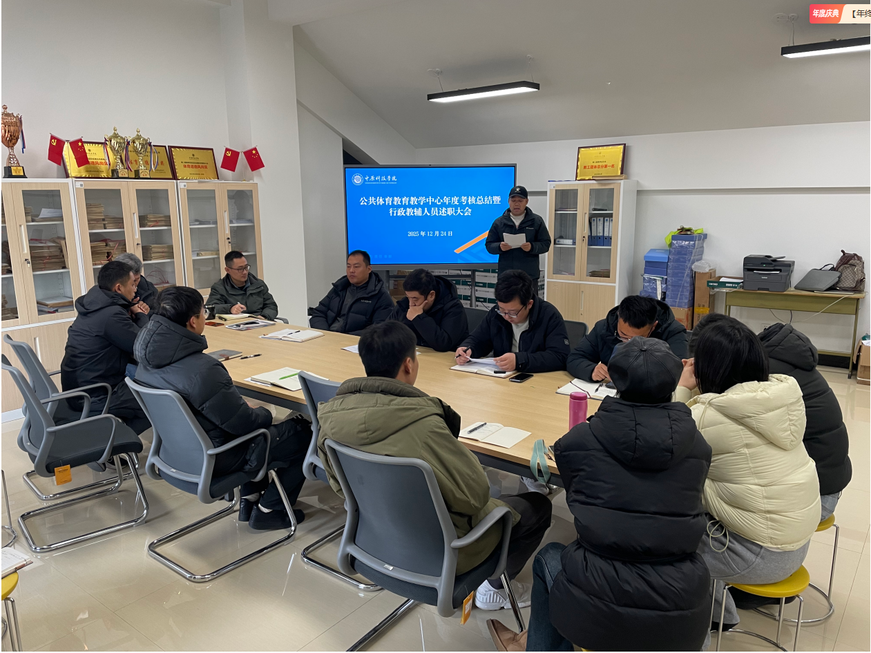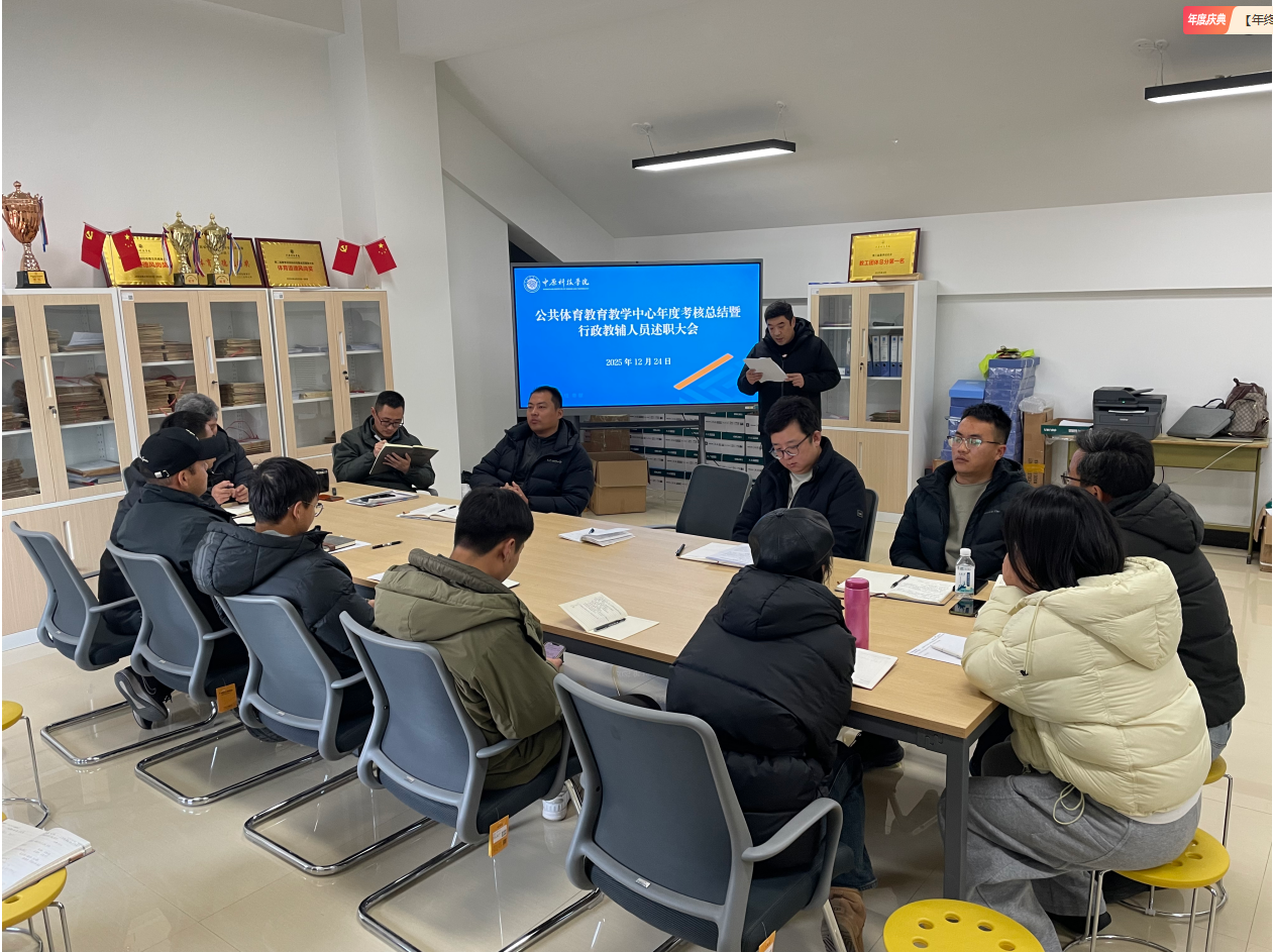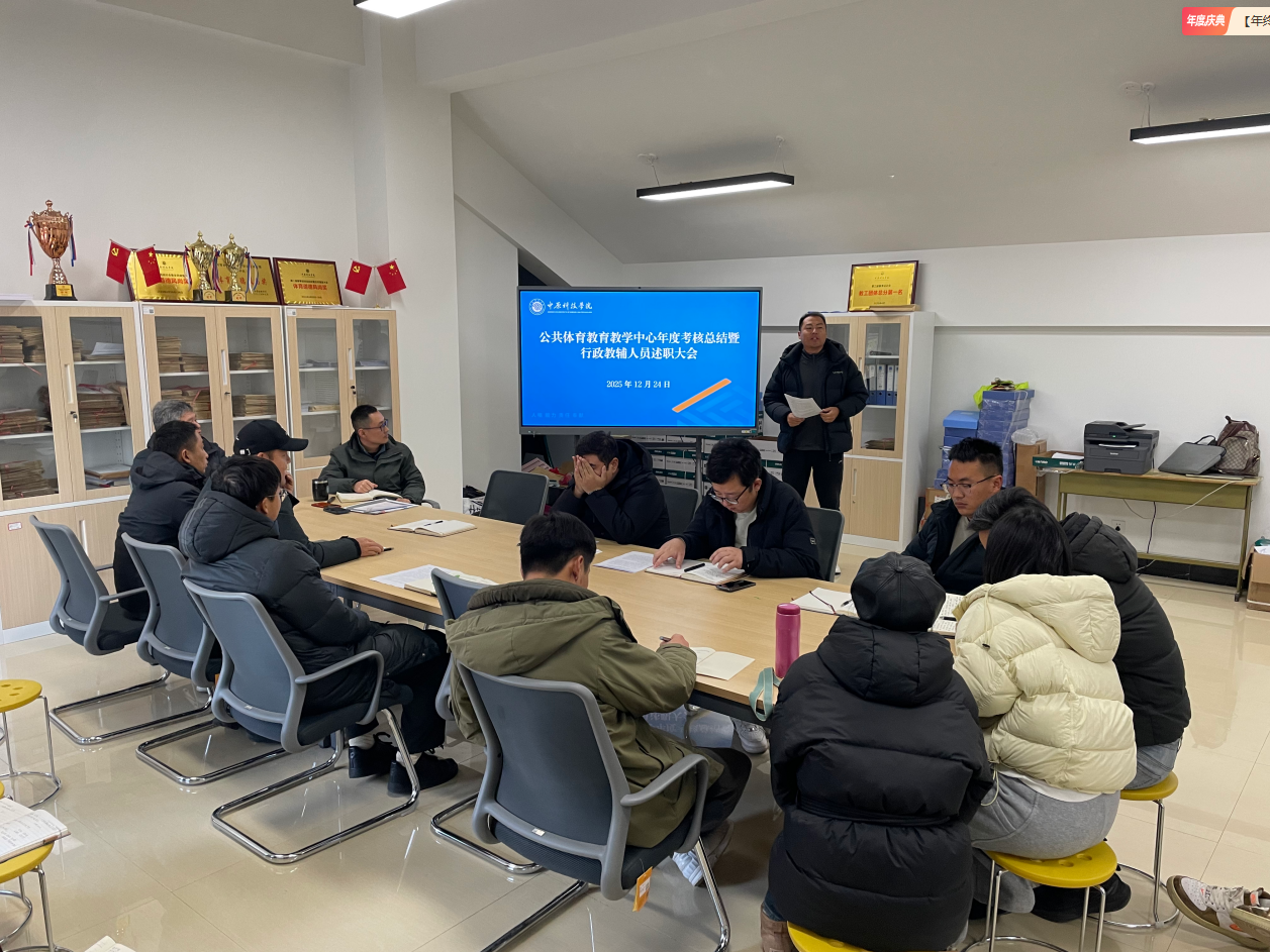 近日,公共体育教育教学中心年度考核总结暨行政教辅人员述职大会顺利召开。中心主任钱文军、党支部书记兼副主任张建锋、主任助理赵宗基及全体教师参会,会议由张建锋主持。