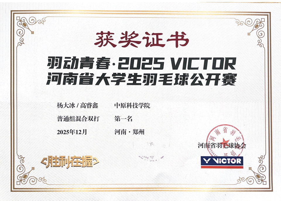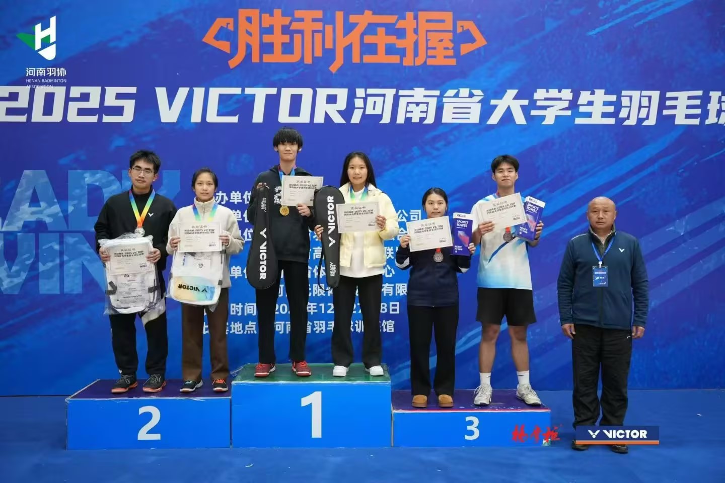 12月28日,“羽动青春•2025 VICTOR河南省大学生羽毛球公开赛”于郑州市河南省羽毛球训练馆圆满收官。我校学子高睿鑫、杨大冰凭借卓越表现,摘得混合双打冠军;杨大冰与米晋钰搭档,荣获女子双打第四名,为学校争得荣誉。